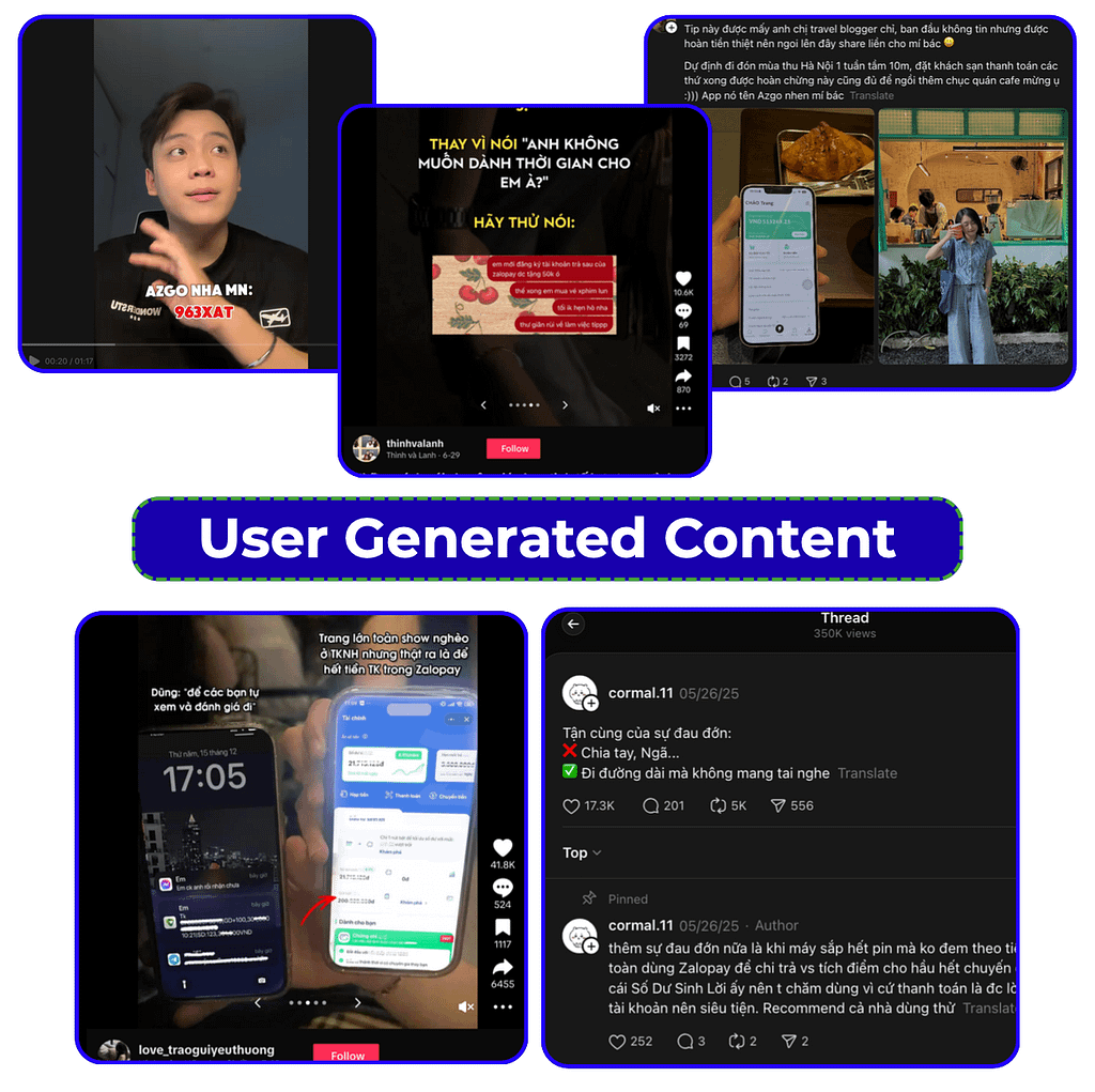 - Zalopay: UGC (viral social media content), Growth (120% Acquisition KPI delivery)
